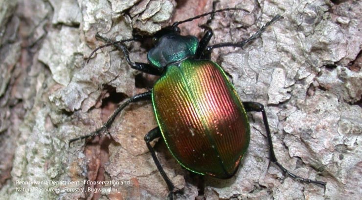 The forest caterpillar hunter is a species of ground beetles. The exterior of these shiny green beetles stick out like a sore thumb, often showing glitters of brown, red, or yellow (oftentimes a combination). The forest caterpillar hunter is native to Europe but was introduced to curtail gypsy moths in New England.